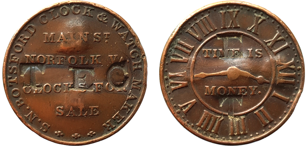 Tid är Pengar. Det ansåg S. N. Botsford Clock & Watch Maker från Norfolk, Virginia. De instämplade bokstäverna har tillkommit i efterhand. Jag tolkar bokstäverna som: T E C (adversen) och E T (reversen). Vad betyder detta? Jag ställde frågan i Facebook-gruppen World och Tokens och fick några intressanta förslag. Ett är att det är ett lyckomynt som någon burit med sig i fickan. Ett annat är att initialerna står för olika partnerskap. På 1850-talet gick Botsford samman med Terhune och bildade Terhune & Bosford. På 1860-talet bildades Terhune & Edwards. Om det kan stämma funderar jag på om T E C kan stå för T(erhune E(dwards C(lock) och E T kanske bara (E)dwards (T)erhune? Jag har egentligen ingen aning och är kanske ute på hal is. Tanken är ändå kittlande, för stämmer det så kan det röra sig om en kontramarkering.