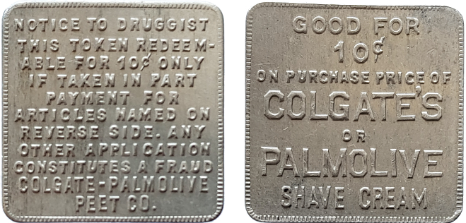 I min ägo finns tre polletter från Colgate-Palmolive Company (eller rättare sagt dess föregångare). Bland företagets produkter finns hud- hår- och munvårdsprodukter varav många blivit storsäljare
