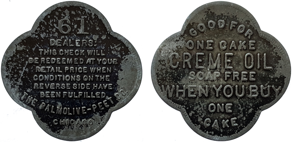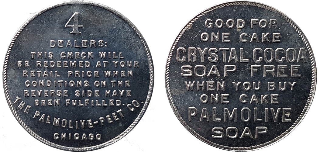 I min samling finns två polletter från The Palmolive Peet Company som hade sitt säte i Chicago samt en senare pollett från Colgate-Palmolive Peet Company.