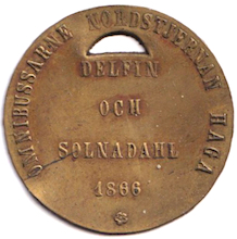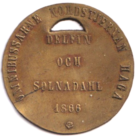 Omnibussarne Nordstjernan Haga Delfin och Solnadal. Mässing. Med halvcirkelformigt hål. 36 mm. SP.5A.19:2. Sti 224:17. Smith Sweden 820V.