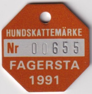 HUNDSKATTEMÄRKE Nr 00655 FAGERSTA 1991