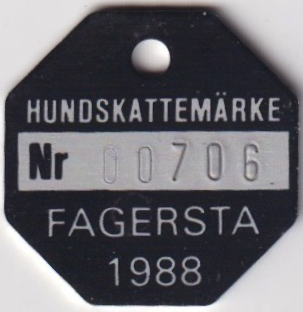 HUNDSKATTEMÄRKE Nr 00706 FAGERSTA 1988