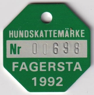 HUNDSKATTEMÄRKE Nr 00698 FAGERSTA 1992