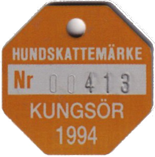 HUNDSKATTEMÄRKE Nr 00413 KUNGSÖR 1994. Gul.