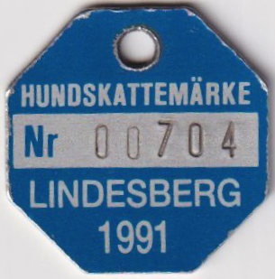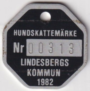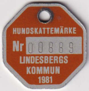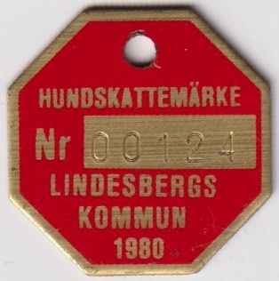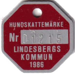 HUNDSKATTEMÄRKE Nr 01215 LINDESBERGS KOMMUN 1986. Röd.