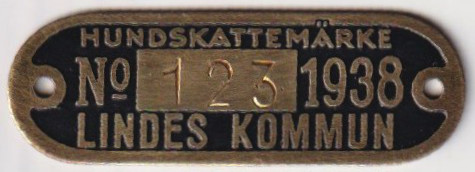 HUNDSKATTEMÄRKE No 123 1938 LINDES KOMMUN. Svart.