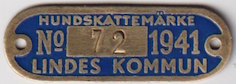 HUNDSKATTEMÄRKE No 72 1941 LINDES KOMMUN. Blå.