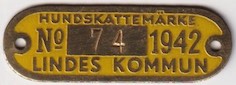 HUNDSKATTEMÄRKE No 74 1942 LINDES KOMMUN. Gul.