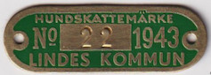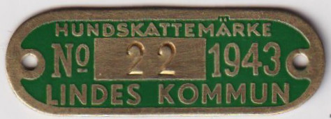 HUNDSKATTEMÄRKE No 22 1943 LINDES KOMMUN. Grön.