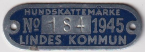 HUNDSKATTEMÄRKE No 184 1945 LINDES KOMMUN. Blå.