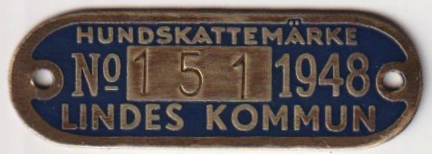HUNDSKATTEMÄRKE No 151 1948 LINDES KOMMUN. Blå.