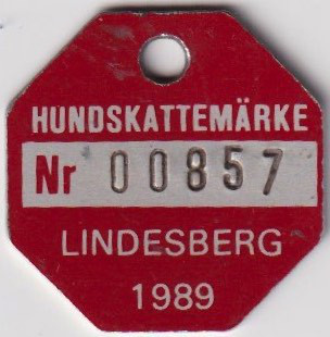 HUNDSKATTEMÄRKE Nr 00857. LINDESBERG 1989. Röd.