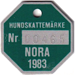 HUNDSKATTEMÄRKE Nr 00465 NORA 1983. Grön.
