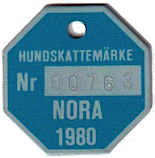 HUNDSKATTEMÄRKE Nr 00763 NORA 1980. Blå.