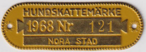 HUNDSKATTEMÄRKE 1968 Nr 121 NORA STAD. Gul.