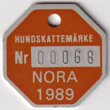 HUNDSKATTEMÄRKE Nr 00068 NORA 1989. Orange.