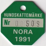 HUNDSKATTEMÄRKE Nr 00509 NORA 1991. Grön.