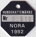 HUNDSKATTEMÄRKE Nr 00510 NORA 1992. Svart.