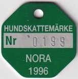HUNDSKATTEMÄRKE Nr 0199 NORA 1996. Grön.