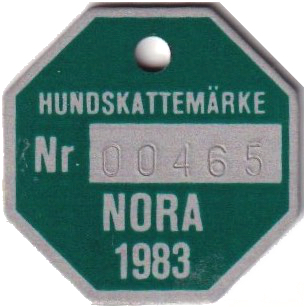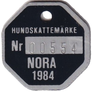 HUNDSKATTEMÄRKE Nr 00554 NORA 1984. Svart.