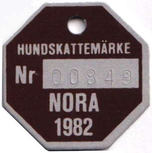 HUNDSKATTEMÄRKE Nr 00849 NORA 1982. Brun.