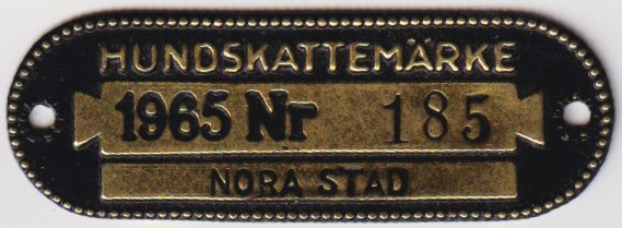HUNDSKATTEMÄRKE 1965 Nr 185 NORA STAD. Svart.