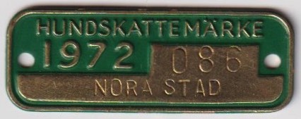 HUNDSKATTEMÄRKE 1972 086 NORA STAD. Grön.