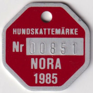 HUNDSKATTEMÄRKE Nr 00851 NORA 1985. Röd.