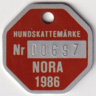 HUNDSKATTEMÄRKE Nr 00697 NORA 1986. Röd.