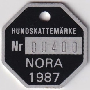 HUNDSKATTEMÄRKE Nr 00400 NORA 1987. Svart.
