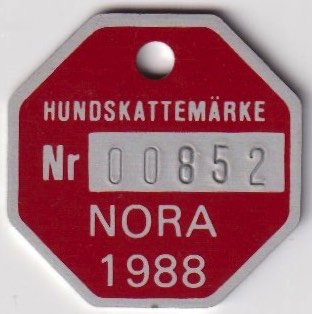 HUNDSKATTEMÄRKE Nr 00852 NORA 1988. Röd.