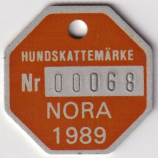 HUNDSKATTEMÄRKE Nr 00068 NORA 1989. Orange.