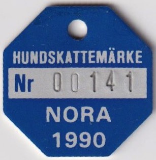 HUNDSKATTEMÄRKE Nr 00141 NORA 1990. Blå.