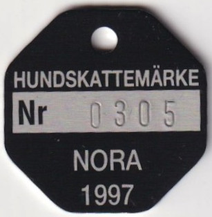 HUNDSKATTEMÄRKE Nr 0305 NORA 1997. Svart.
