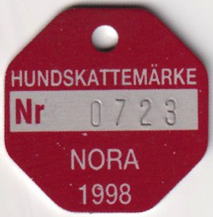 HUNDSKATTEMÄRKE Nr 0723 NORA 1998. Röd.