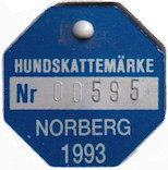HUNDSKATTEMÄRKE Nr 00595 NORBERG 1993. Blå.