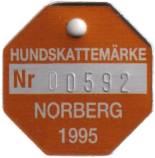 HUNDSKATTEMÄRKE Nr 00592 NORBERG 1995. Gul.