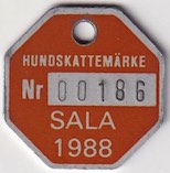 HUNDSKATTEMÄRKE Nr 00186 SALA 1987. Svart.