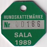 HUNDSKATTEMÄRKE Nr 00186 SALA 1989. Grön.