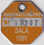 HUNDSKATTEMÄRKE Nr 01107 SALA 1990. Blå.