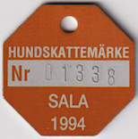 HUNDSKATTEMÄRKE Nr 01338 SALA 1994. Orange.