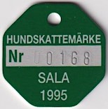 HUNDSKATTEMÄRKE Nr 00168 SALA 1995. Grön.