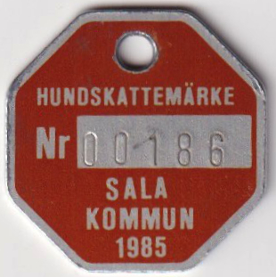 HUNDSKATTEMÄRKE Nr 00186 SALA KOMMUN 1985. Röd.