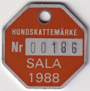 HUNDSKATTEMÄRKE Nr 00186 SALA 1988. Orange.