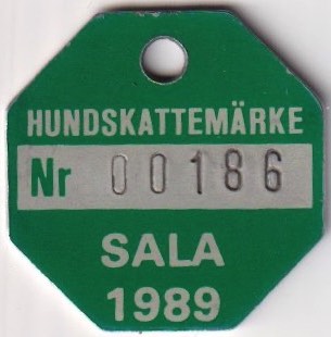 HUNDSKATTEMÄRKE Nr 00186 SALA 1989. Grön.
