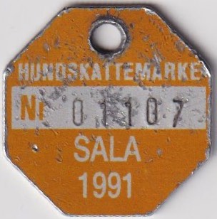 HUNDSKATTEMÄRKE Nr 01107 SALA 1991. Orange.