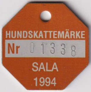 HUNDSKATTEMÄRKE Nr 01338 SALA 1994. Orange.