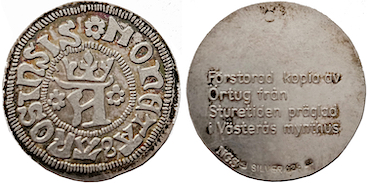 Förstorad kopia av Örtug från Sturetiden präglad i Västerås mynthus