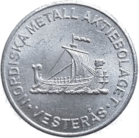 NORDISKA METALLAKTIEBOLAGET VESTERÅS. Vikingaskepp åt höger )( Reversen lika. Rund. 24 mm. Aluminium.