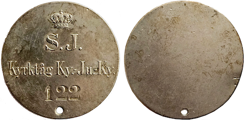 Krönt S.J. Kyrktåg Ky. Ju. Ky 122 42 mm. Vitmetall.